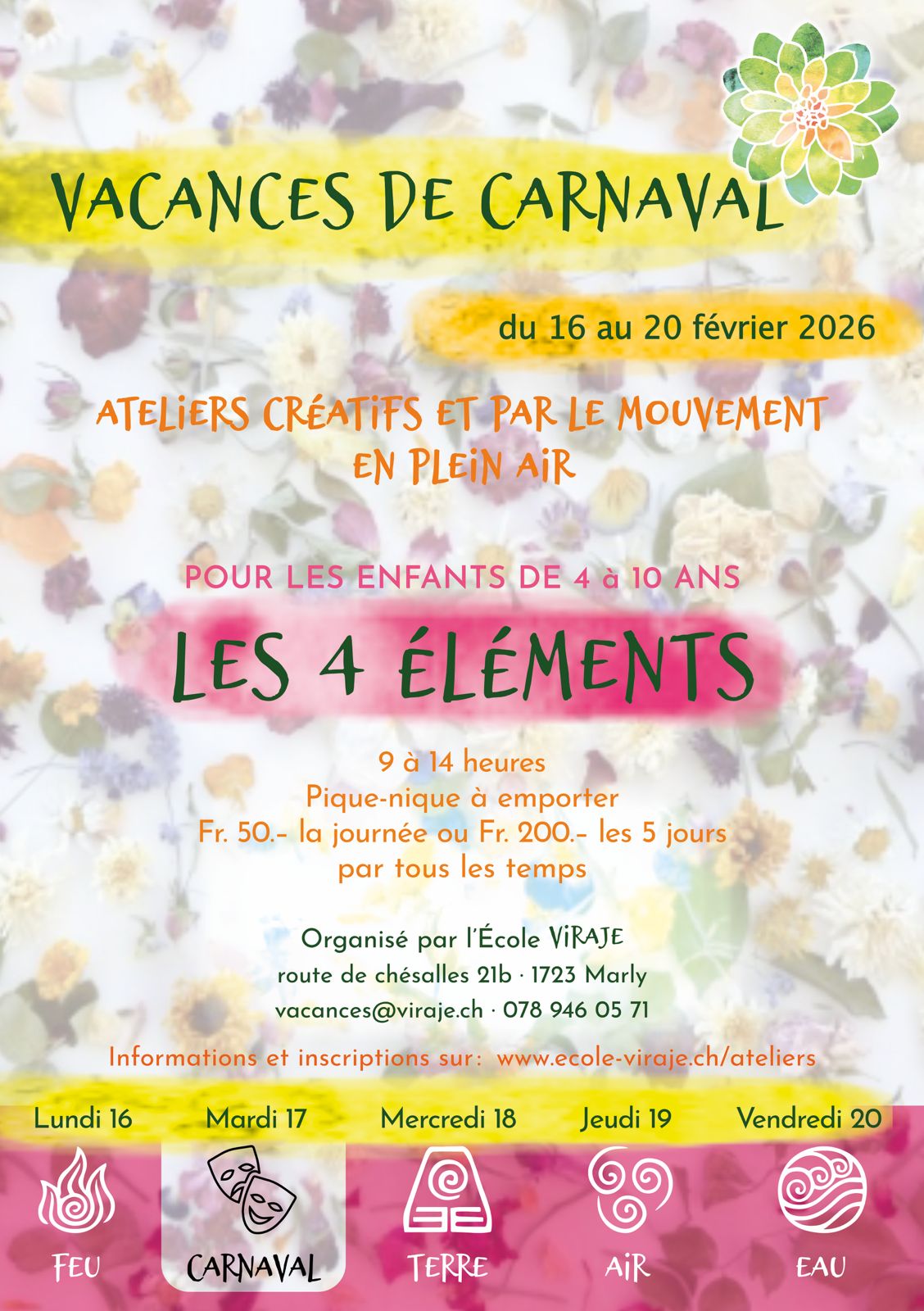 Chaque jour sera dédié à un des 4 éléments à part le mardi qui sera consacré au Carnaval avec déguisement, cortège et construction d’un Rababou qui sera brûlé dans le champ, derrière l’école dès 13h. Les parents sont les bienvenus pour le cortège et voir brûler le bonhomme hiver.